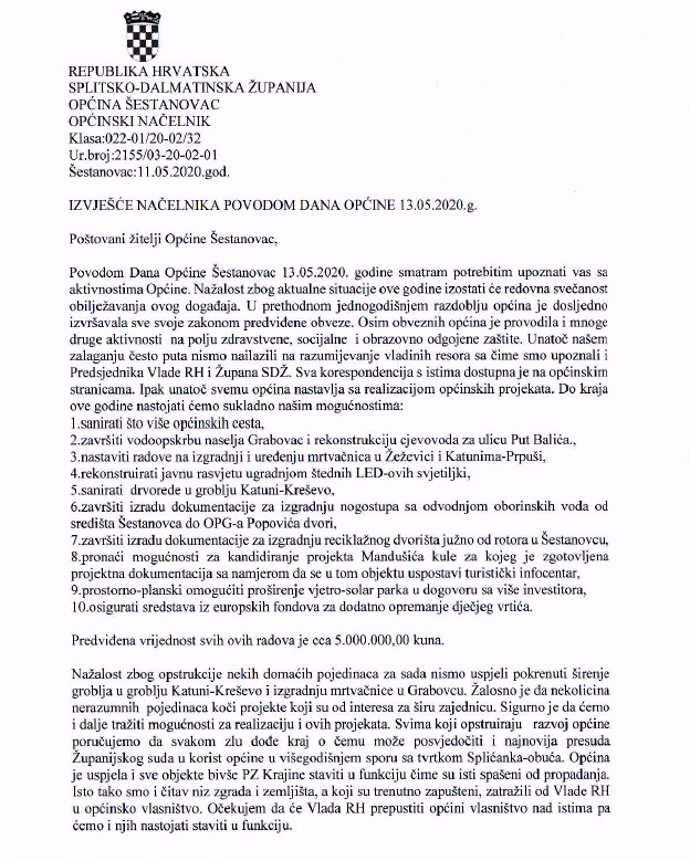 Izvješće Načelnika povodom dana Općine Šestanovac, 13.05.2020.